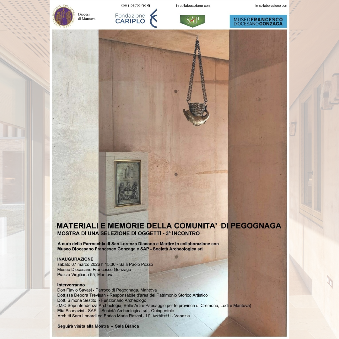 Sabato 7 marzo alle 15:30 al Museo Diocesano “Francesco Gonzaga” di Mantova si terrà l’inaugurazione della mostra e una conferenza dedicata a Pegognaga: una narrazione che attraversa i secoli, dai reperti emersi durante gli scavi archeologici fino alle linee moderne della nuova architettura sacra per la chiesa dedicata allo Spirito Santo. La mostra anticipa inoltre un importante traguardo futuro: il recupero dei locali adiacenti alla chiesa dove, a partire da agosto 2026, i reperti troveranno una collocazione permanente e fruibile.